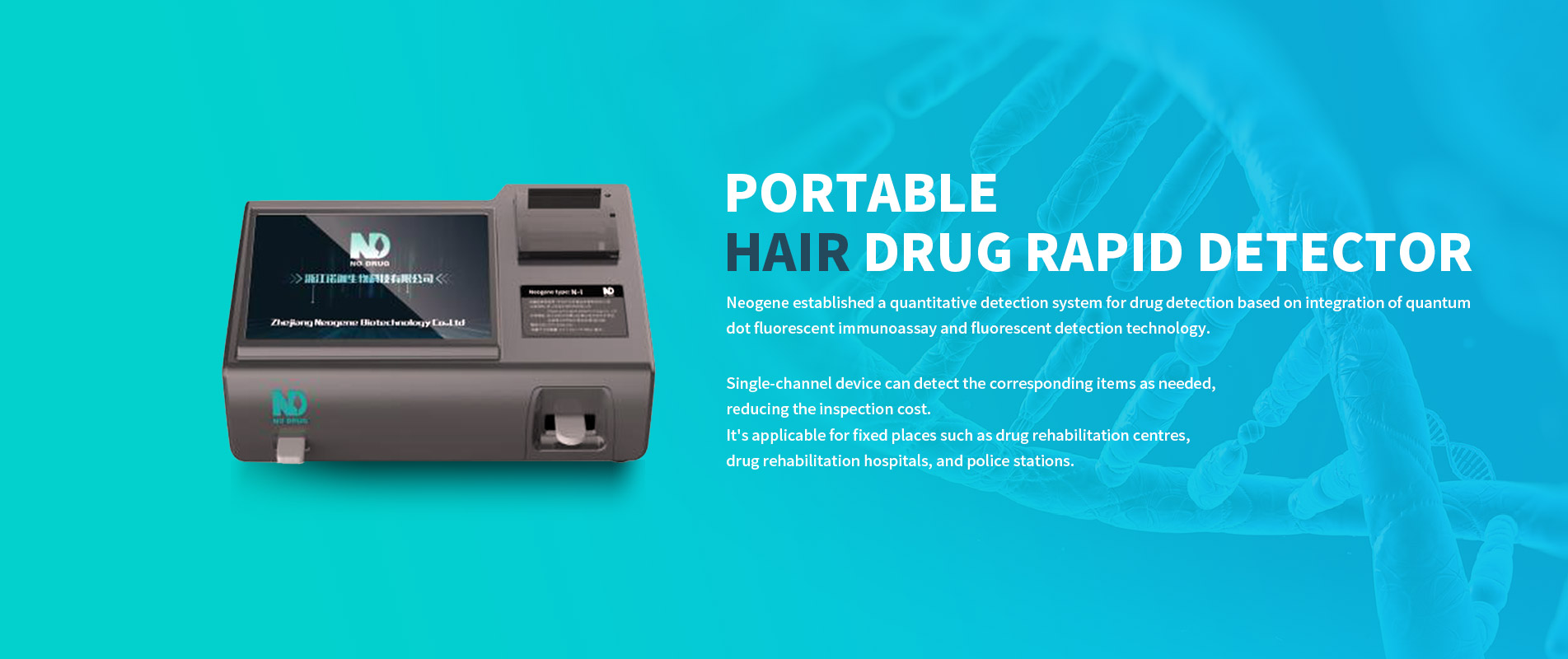 Rapid drug testing products are developed by ND independently. Passing rigorous inspections, ND products are approved by Ministry of Public Security and Police Electronic Product Quality Testing Centre.the company's self-developed hair drug detection technology and products are in leading positions in the market. The handy, easy-operated handheld and portable hair drug testing devices are easy to take samples, and can adapt to various testing environments. Multiple drugs can be detected, such as heroin, morphine, methamphetamine, ketamine etc. The reagent kit can be stored at normal temperature, thus, convenient for transportation and storage. The equipment is with supreme functioning quality, for instance, fast detection speed (within 5 minutes), high detection sensitivity (0.2ng/mg, in line with the standard of Ministry of Public Security), and strong thermal stability (tolerance to 45 °C).